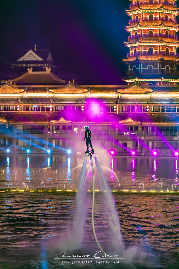 晚上八点半一到,这湖面上瞬间热闹了起来。随着一曲《节日欢歌》的奏响,不知从哪儿冒出来的水上飞人就来了一个空中前滚翻,身着七彩闪光铠甲,在流光溢彩的光柱之中来回穿梭,随着音乐在舒缓悠扬与高昂激越中更替,舞秀的光色也变幻万千。