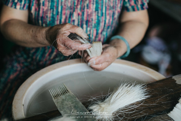 当然最有意思的是,我们遇到了一家做湖笔的作坊,出于好奇我们便走进去看了看。这是一家用自己家的房子改造的小作坊,一共七个人在这个不算亮堂的小作坊里辛勤劳作着。