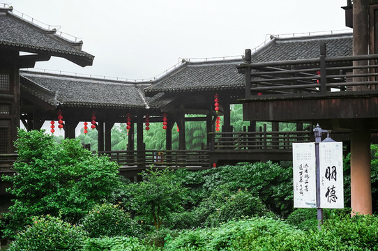 进入园中,放眼望去仿唐的古建筑中的正中,正是这大唐的贡茶院。这里三面环山,山却不高峻,一面开阔,却道云深不知处,细雨濛濛,云烟升腾而起,极具世外桃花源的意境。