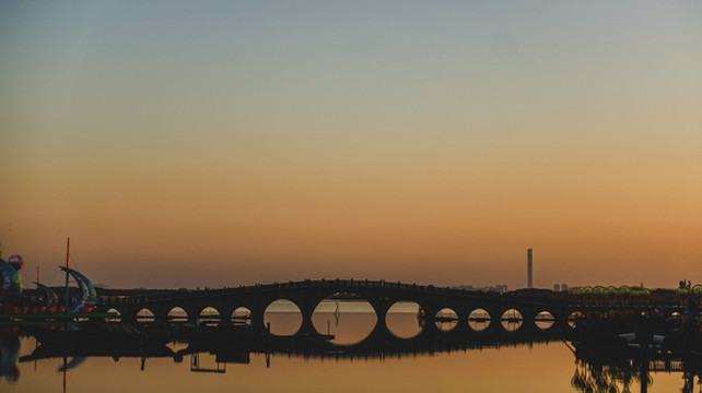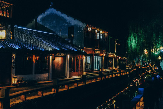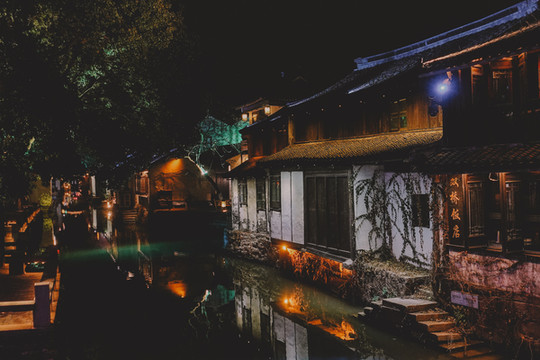 我们正好坐的是最后一班可夜游的船,“下班”了的船支静静停靠在温柔的水湾边,渔船上还有没熄灭的点滴灯火,与朦胧夜色完美融合在一起,“枫桥夜泊”大概就是这样一个动人画面吧。