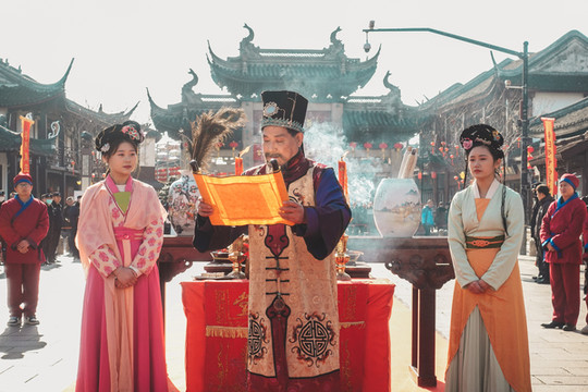 2021年元旦第一天的一大早,是周庄最隆重的开庄仪式,我们也早早爬起来,沐浴着冬日暖阳,来到汉服出租店,是的,没错,我们准备换上特色汉服,去参加开庄仪式。