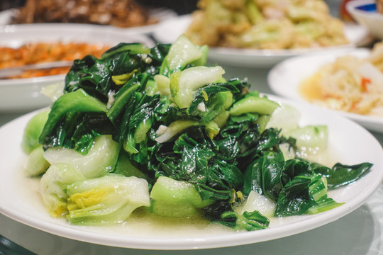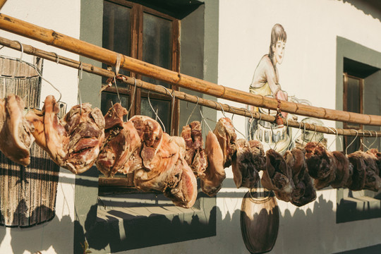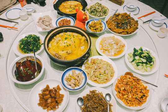 这时候,隔壁和风里餐厅的老板来叫我们去吃年饭了,进到餐厅,已是满满一桌子热气腾腾的美食,虽然还是少不了这两天常吃的那几道传统菜肴,但每一个地方做出来都有自己不一样的味道,这次的餐桌上还有下午新鲜从菜地里刚摘出来的青菜,清甜可口。