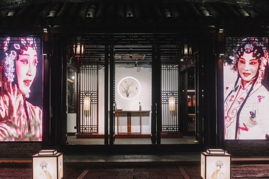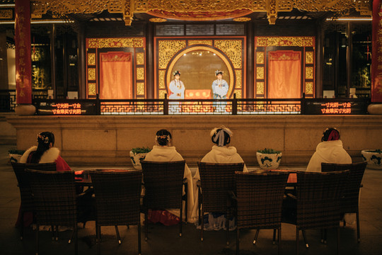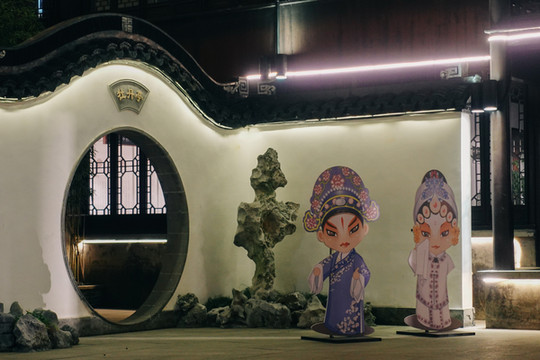酒足饭饱后,走在渐晚的天色里,朝着古戏台走去,周庄人都爱听戏,据说沈万三和他的亲家都是著名的昆曲票友,于是把周庄的古戏台,改造升级成了清风明月·周庄梨园,梨园被打造的很优雅有情调,来此的游客可以一边品茶,一边欣赏“百戏之祖”的昆曲。
