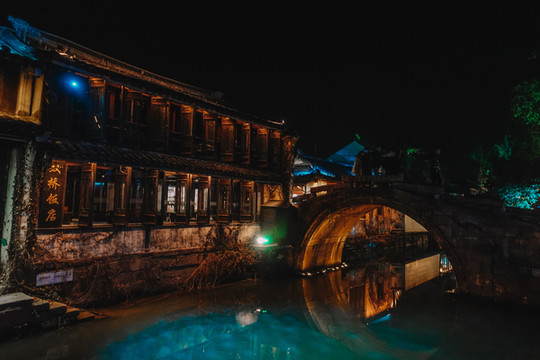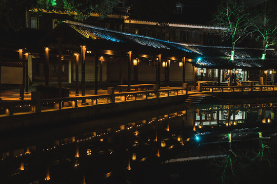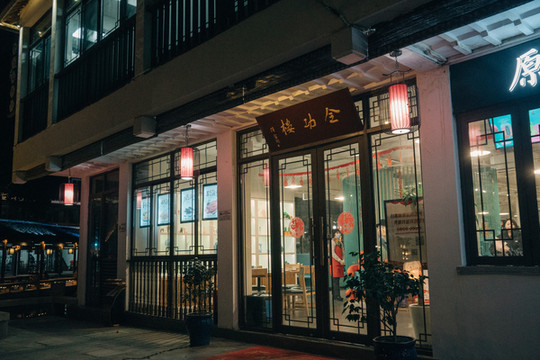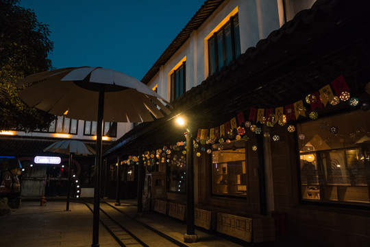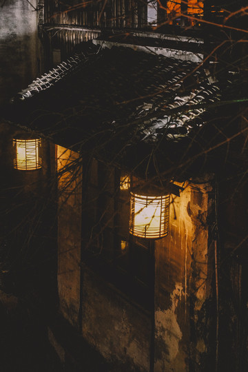 全功楼时尚餐厅出来就是有着各种图案灯笼的湖边小道,沿着湖边慢悠悠散步回去,湖两岸的老宅子里亮着温暖的灯光,斑驳古老的墙壁上是水波荡漾的流动感,冬天的晚风虽然有一丝寒冷,但也都在这样美好的夜色里变得没有那么冷清和孤独。