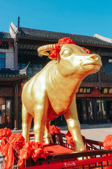 今年是牛年,周庄也在入口处放了一只巨大的金牛迎接客人,关于这个金牛,也流传着这样一个说法:“一摸春牛头,福气自来投,二摸春牛腰,钱财就上腰,三摸春牛尾,福寿不见尾“,路过的客人也都开心的抚摸着这只大金牛,这一切也预示着周庄的财运年即将开始。