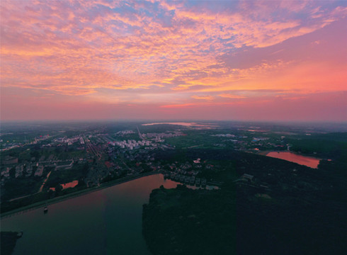 天在将黑未黑时最美,光线也最柔和,是以夕阳无限好,天空的云彩仿佛水彩画一般倒映在湖面上,而远处的茅山恰似一条巨龙静静地横卧在湖畔,一切都是美好的模样。