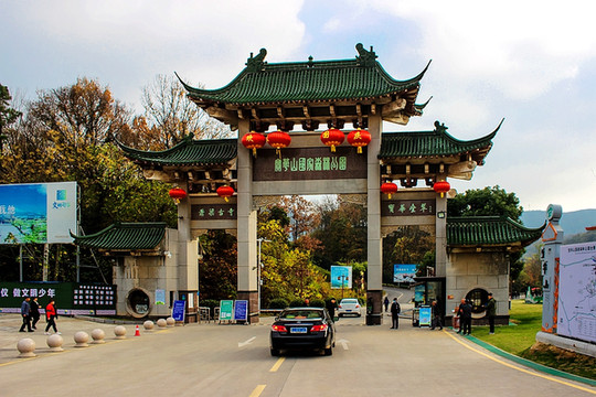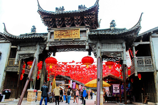 从宝华山国家森林公园大牌楼步行10分钟左右,来到千华古村前,穿起“尽纳山光”石牌坊,从入口广场到龙藏浦街,是千华古村的前街部分,街道两旁分布着各种各样传统店铺。