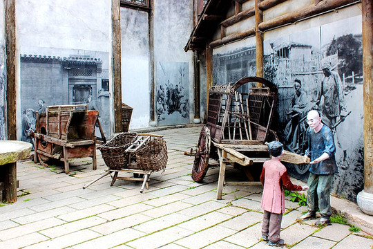 作为道具摆放在古街石板路上的独轮车,对于独轮车,那些都是千年的岁月记忆,许多人只在电影、电视中风过。