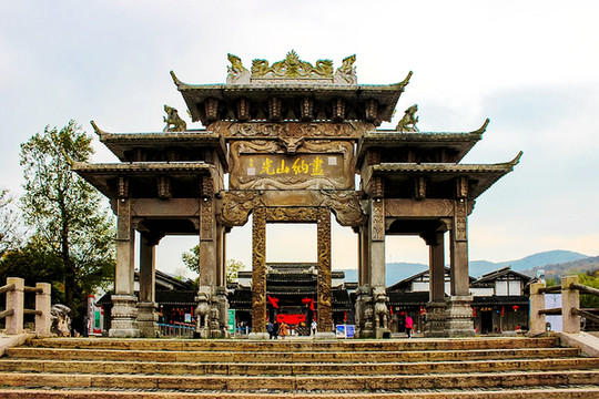 千华古村,位于江苏镇江市句容的宝华山脚下。石牌坊背面记载着一段曾经的历史,乾隆皇帝六次下江南都来这里,还在宝华山留下了著名诗作。他曾写下“宝华深秀处,问路记吾曾。是日观民暇,青春佳兴乘。”的诗句,从中我们不难看出,走出了高墙深院的紫禁城,徜徉于宝华的山水之间,乾隆的兴致是何等之高!千华古村虽然被称为古村落,可是,千华古村完全就是一个模仿明清时江南民居而新建的一个小村,一座座灰砖木结构的建筑都是根据山体建造的。但其深厚的历史文化底蕴依然存在,踏进这里,还是会给人一种来到明清古村落的感觉。
