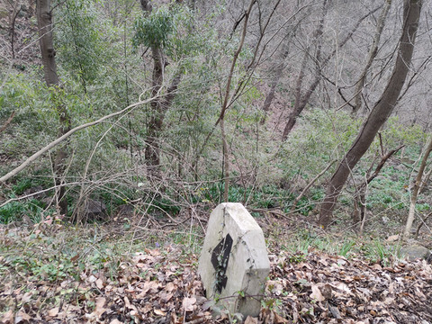 路边的树林没有路,我们往里面走了一小段,还是退了回来,继续沿着水泥路走,路边有农家自己盖的小屋。我们走近了,被里面的狗吓得退了两步。不过想着前面树林愈加的密,而前往大华山似乎也没有其他路可以走,还是硬着头皮往前走了。手里拿着因为怕中途下雨而带着的雨伞,护在身前也可以当成武器。狗并不大,想来我们两个成年人对付起来应该不难。其实小狗虽然叫得很欢,但是我们走得近了,它反倒往回缩了回去,原来只是装亲子吓唬人的啊!
