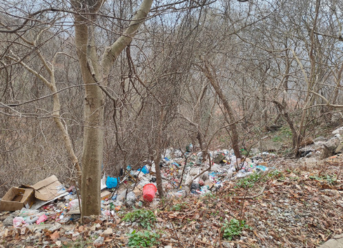 道路的一侧山坡上,有很多垃圾。我们挺疑惑,看起来这里应该来的人还不少才对,不过我们一路攀登,还真没有看到有其他的人走过,连车都没有看到一辆。是因为今天不年不节,所以才没有人吗?按理说,不管这山没怎么开发,总有徒步的爱好者会来造访的吧?