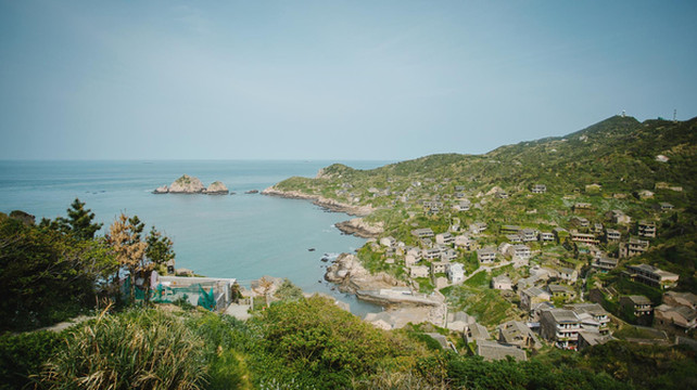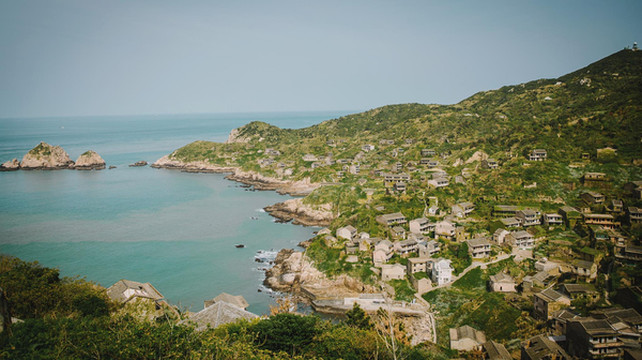 从大悲山上下来,沿着环海公路蜿蜒,随处闲逛便到了东海渔村,这个有山有海的世外桃源位于嵊泗本岛的最东边,整个小村庄成簸箕形,三面环山,一面面海。据说这里是嵊泗最文艺的一座小渔村,金沙渔火,碧海奇礁,自然风光旖旎,渔家气息浓郁。