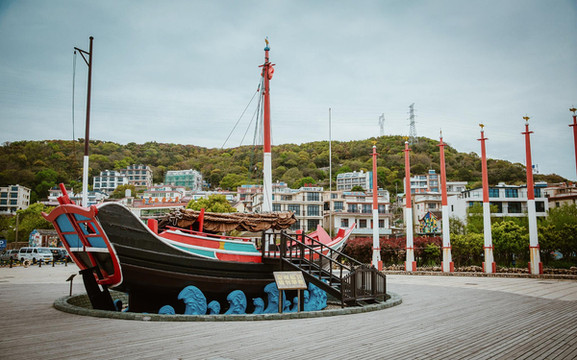 继续往前,渔村广场高耸的桅杆和大木船气势非凡,总会引得游人驻足拍照,欣赏留念。