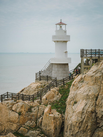 沿着木栈道一直往前,便是六井潭的标志性建筑—一座伫立在蓝色海岸礁石边上的白塔。因为疫情原因现在灯塔上是不允许进去的,只能在塔下或是远远的观望着。