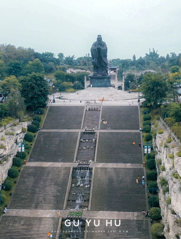 向着湖面,百级阶梯上有着一座非常雄伟的孔子雕像;