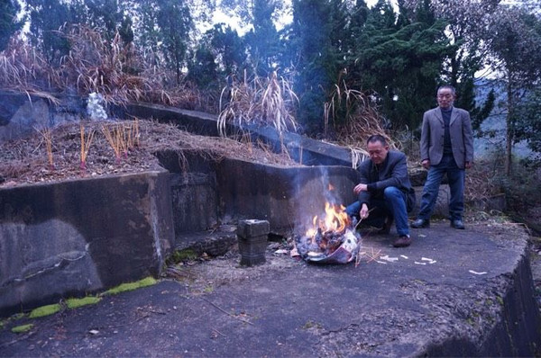 宗亲带领大家烧纸丶焚香丶三鞠躬丶放鞭炮,做了祭拜。