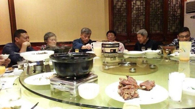 二中副校长启志设告别晚宴,大家与77岁的周村老辈共歺。