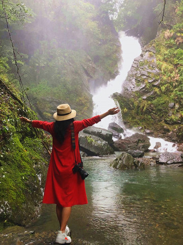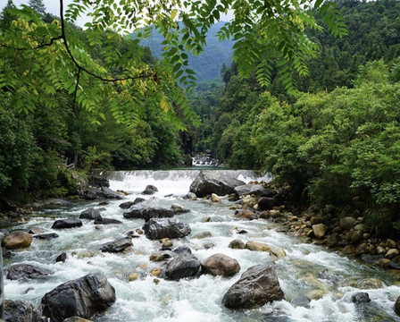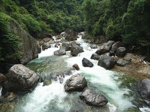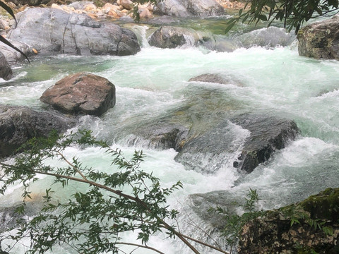 远远地,便听得水声轰隆喧哗,穿过一段石径,四叠瀑布出现在眼前,不由想起《秋浦歌十七首》第五首“秋浦多白猿,超腾若飞雪。牵引条上儿,饮弄水中月。”瀑流白练般自幽深看不到边际的山之崖奔泻而下,迂回曲折,如繁弦交鸣,似骏马咆哮,汹涌壮观,水珠飞溅,湿气氤氲,凉意悠悠,舒适怡然。
