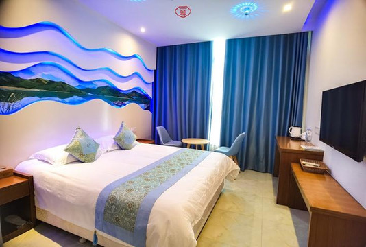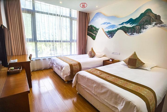 这是位于西黄山富硒展览馆楼上三楼、四楼的西黄山富硒主题客栈,民宿的装修还是蛮有特色的,不同主题房间装修都是不一样的,风格主要是依托当地原生态自然景观为表现手法,结合灯光艺术,包括蓬莱洞,秋浦河,富硒茶园和牯牛降四种主题客房。