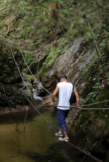 不要看百丈崖小,但这里风光也不输别的景区,谷幽泉深,风景秀丽,有高大瀑布、深潭、峡谷地形,垂直落差100多米的百丈飞瀑尤为壮观。在这样的环境下,景区其实有设置很多可以用来户外探险的体验,比如攀岩、走梅花桩、滑索、空中飞人、过情人桥、走钢丝等。