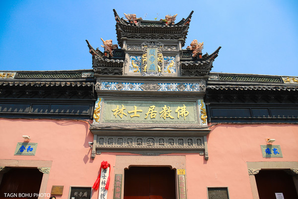 佛教居士林、位于月湖文化景区的柳汀洲上,右毗贺秘监祠,后临月湖。风景幽雅,瑞气霭林。林内诸座殿宇蔚为巍峨,雕梁画栋,古朴典雅,重楼歇顶,庄严清净。碧波荡漾的“放生池”及飞檐玲珑的“水云亭”,构成人喜人爱的怡人景观。该林始建于元世祖忽必烈至元二十一年、1284期间、初为家祠。经过年代的久远,在1989年后修复大雄宝殿、三圣殿、地藏殿、弥勒殿、念佛堂、放生池等