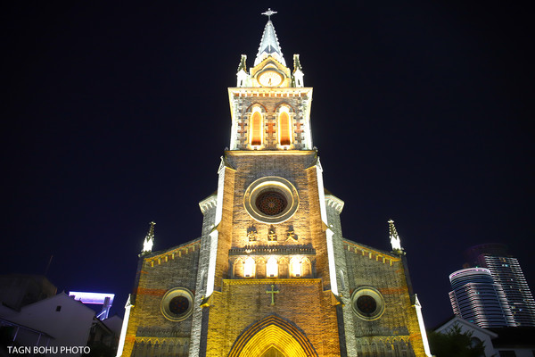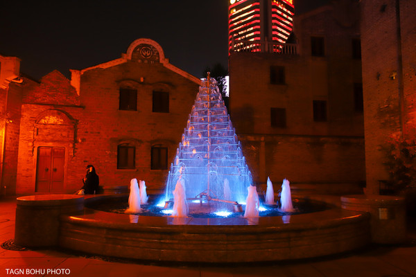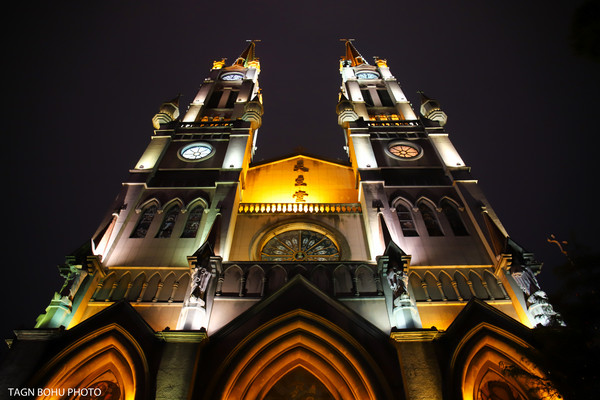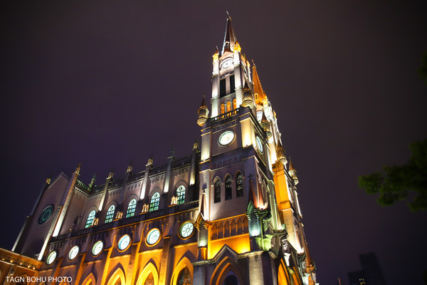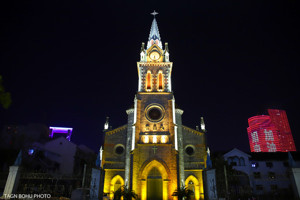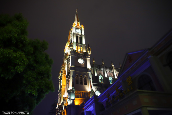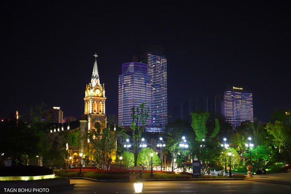 改造后的宁波老外滩,保存了1872年建造的天主教堂和数十幢有建筑特色的老房子。这些建筑或中式结构西式门面、或西式雕花的石库门,既有洋气的欧陆建筑风格,又含浙东民居建筑的传统,显现着中西文化的交流融合。从外滩沿着另一侧经过桥底走出来就能看到天主教堂,在灯光的照射下教堂很美丽。教堂前面的喷泉一直喷着水。