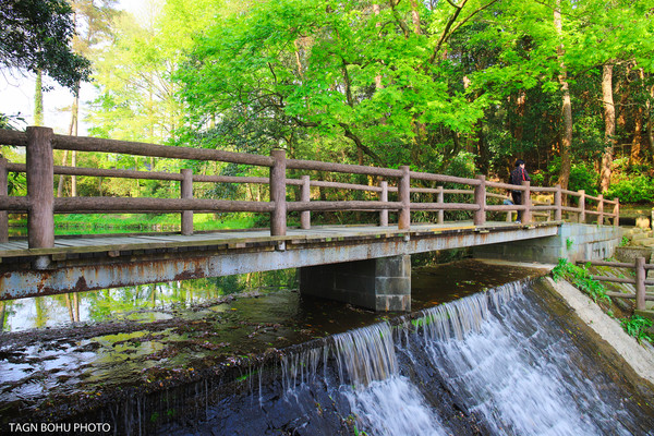 在千丈岩瀑布入口处有一小湖,周围郁郁葱葱的树木,还有好几棵樱花树开满了整棵的花朵,从这里过去后就到了瀑布的门口了,进去后又有一个池塘,这里就是瀑布直流而下的出口,可以到瀑布的出口看下去非常的壮观,又很惊险。