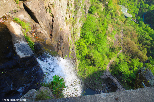 走过一座小桥就来到了这里就是瀑布自崖口出,至潭底,落差1 7 1 米。人可以走到瀑布流下去的地方俯瞰下面,真的很高,对面的山都能看到,瀑布就是从这里流下去的,在这里你可以亲身感受到直流三千尺的感受。下面还有缆车,从瀑布口看下去显得很渺小,可以沿着路牌的指示到下面去看壮观的瀑布。