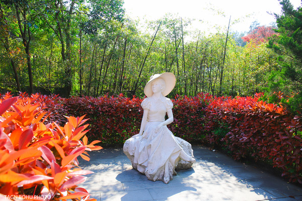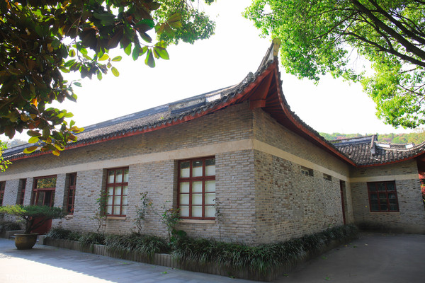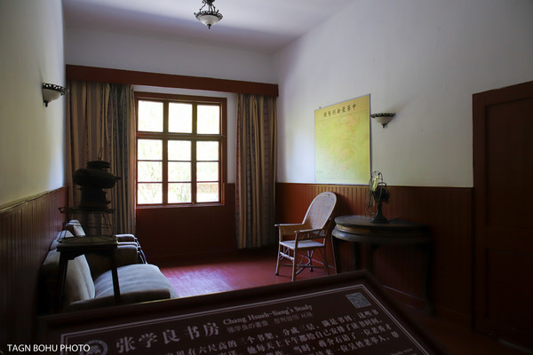 一个小庭院,一幢小楼,两座塑像,分别是张学良和赵四小姐。在张学良的塑像下刻有周恩来题词“千古功臣”。而赵四小姐的雕像是用汉白玉雕刻的,坐庭院里,栩栩如生。从这里可以看到对面的雪窦寺,景色优美。在当时这里可是非常的幽静之处。