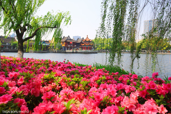月湖旁的杜鹃花五彩缤纷、夺目耀眼,柳树像一位披头散发的美丽少百女,在微风中翩翩起舞,她的舞蹈婀娜多姿,十分优美,令人陶醉。