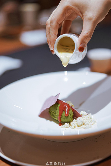 最后一道是甜品,由青豆泥,沙拉酱,树莓脆片,树莓酱,坚果粉末组成。