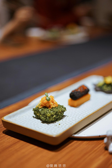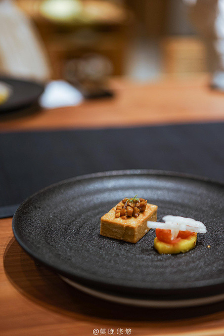 前菜,炭黑脆片,山药,绿翠豆腐,泡菜还有果冻,几种看起来毫不关连的食材组合在一起,不止外观好看,吃起来味道也是绝了。