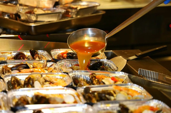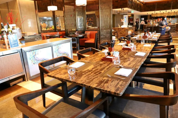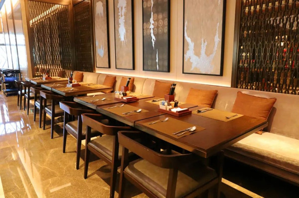 装潢精致典雅,设有开放式厨房。极致的美食,诱人的香味,覆盖了您的味蕾。餐厅配有若干个现场烹饪食台供客人选取美食,例如面点档、凉菜档、海鲜档、扒房,甜品档。