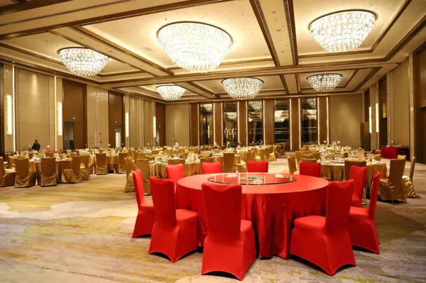 除此以外,针对宴会,在酒店里还有一个超大的宴会厅,一眼望去,无柱子的大厅很豪华,这是运用了东方建筑美学---藻井的造型做法,9盏大型灯具寓意祈福,层高8米,端庄又有独特文化仪式感。地毯花纹,结合高圈低割层次仿佛使客置身于花木丛中,香气馥郁,东意西境。住得好,吃得好,当然也要玩得好:【国恩寺】