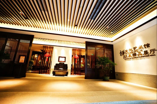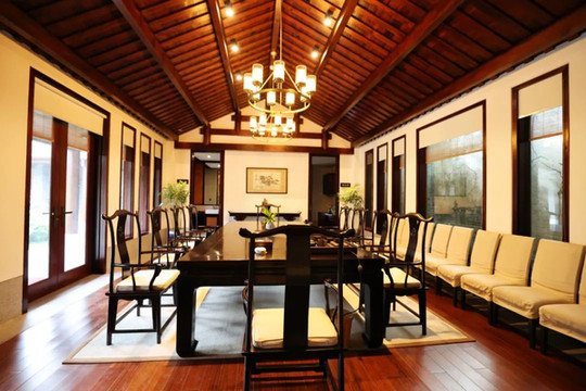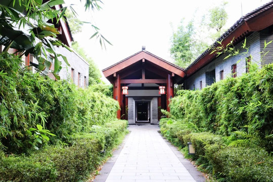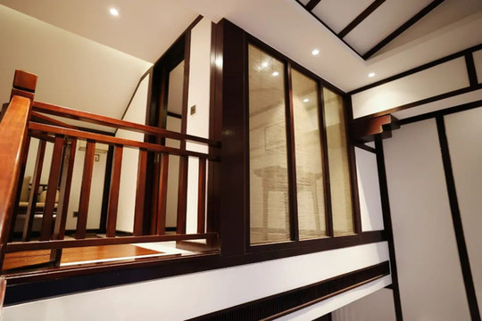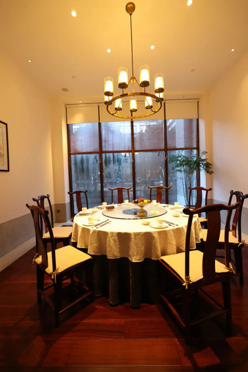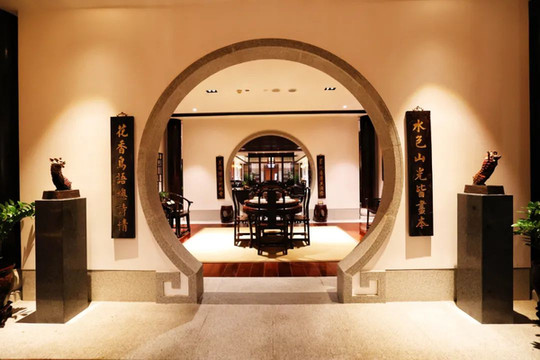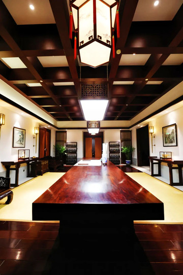 占地面积2380平方米,所有配套家私均为小叶紫檀打造。为追求更极致的年代感,门口从屋顶、横梁到门挡再到地上的麻石,全部是在酒店建造之初就从江浙一带和广东的乡村所收集。门口的 “门当”就是成语“门当户对”中的门当。
