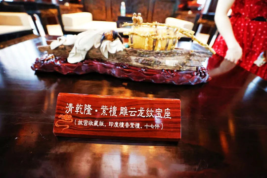 在酒店里,到处都有宝藏,今天去看的地方是一个宝藏的展馆:【禅文化红木精品展厅】,红木展厅玄关处摆放的是小叶紫檀材质的云龙宝座,非常霸气,雕工细致入微。整个红木展厅基本上是依据客厅、餐厅、书房、卧室的形式逐步进行展示。(我后面才知道,只要是用小叶紫檀做的,全部都是价值连城的)