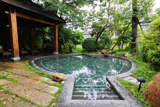 这地方拍雨景很好看,如果用慢速拍摄的话,居然感受到有一种大雪纷纷的美感。【温泉会所】游玩菩提园可以玩一天,然后温泉会所也是可以玩一天的,就在酒店的旁边,来到了亲水平台。