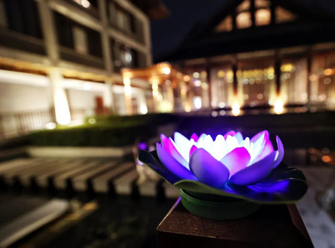 到了晚上19:30,酒店里还有放莲心灯的活动,在树下拿着莲心灯往六祖堂放下心灯祈福许愿呢。【三不佛】
