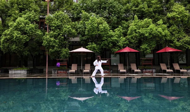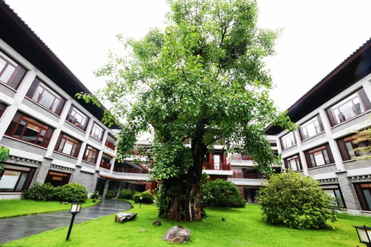 在酒店的水帘大堂附近,每周二四都会有老师教大家打太极,禅武太极是好东西,珊珊也试试在平静的游泳池边舒展筋骨,直接进入人类养生的最高境界!【禅文化打卡点】除了禅文化的活动以外,酒店里还有酒店里有很多很有意思的禪文化的打卡点。【两百年的菩提树】