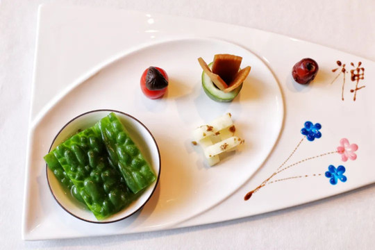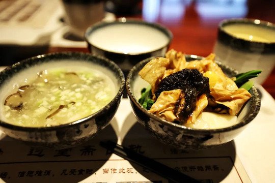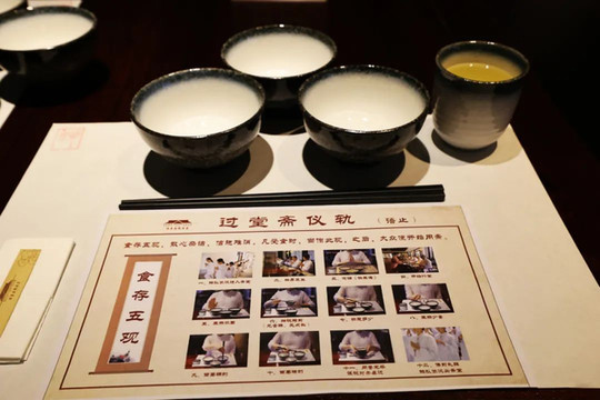 在刚刚品茶的【禅心斋】里,还可以品评地道的斋菜,这里的斋菜有“过堂斋”和精品斋菜等,中国汉传佛教禅宗寺院的过堂斋,既然是针对“吃”这种“进食”行为所量身设计的一种“禅修”方式,大家可以看看上面的【食存五观】就知道,除了提倡“素食”“疗饥”之外,还制定了一套完整的仪轨,来规矩僧侣的“进食”行为。