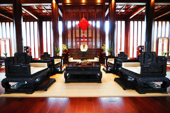 会客厅称为明镜堂,在古代有明镜高堂的说法,客厅内摆放的所有家具全部由小叶紫檀所打造,一张宝座的收藏价值相当于一辆法拉利跑车,非常珍贵。