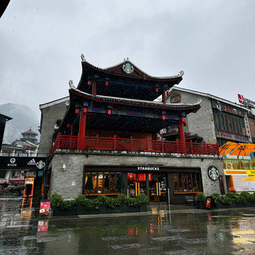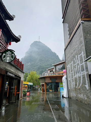 在西街里的这家星巴克,是阳朔唯一的一家星巴克,装修风格很中式,可以通过室内的电梯上到二楼三楼的观景台,在那里拍照会非常出片,夜景很美,三楼可以俯瞰整个西街,由于今天是我们整个旅程中唯一的一个雨天(还很大),所以也没有上去拍照了。