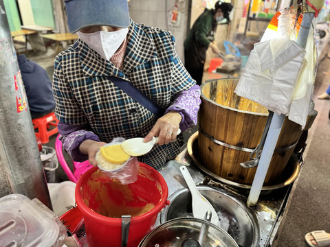 还有这个糯米饭,下面是糯米,中间夹一层绿豆沙,是3块钱一份,如果在加一根香肠,就是5块钱,我们加了香肠之后,一咬油滋滋,口感爆棚!