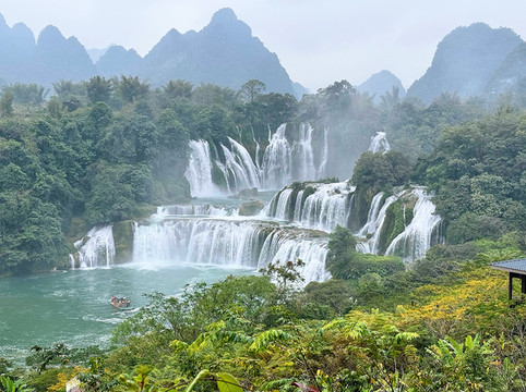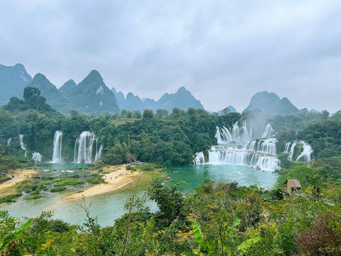 左边就是越南的板约瀑布,右边的就是我们的德天瀑布,中间是归春河,这个就是德天跨国瀑布的由来。