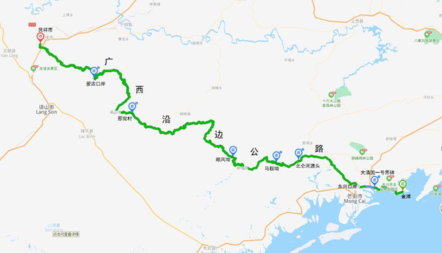 向西可以走高速,也可以走国道。某租车网站zzc推荐了广西沿边公路。