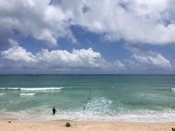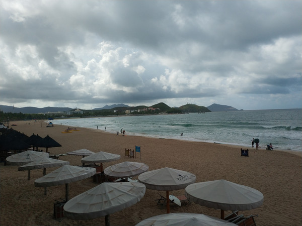 沙滩白净宽长,但由于风太大,并无游人敢下海,