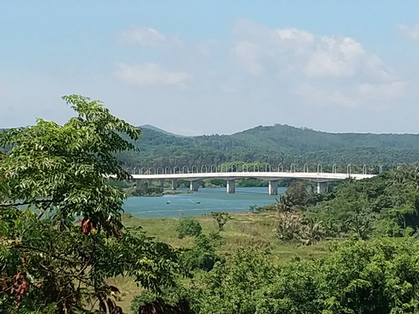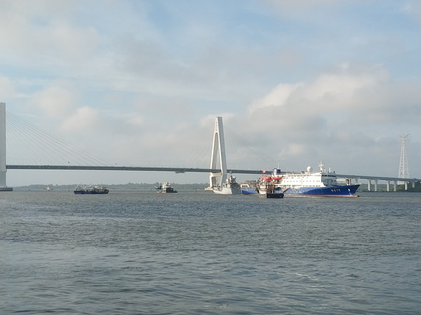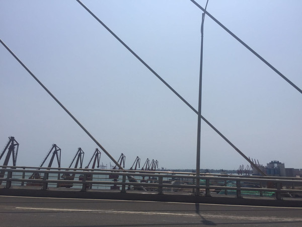 行驶过雄伟的洋浦大桥,桥下的港区很多桥吊在阳光下熠熠生辉,
