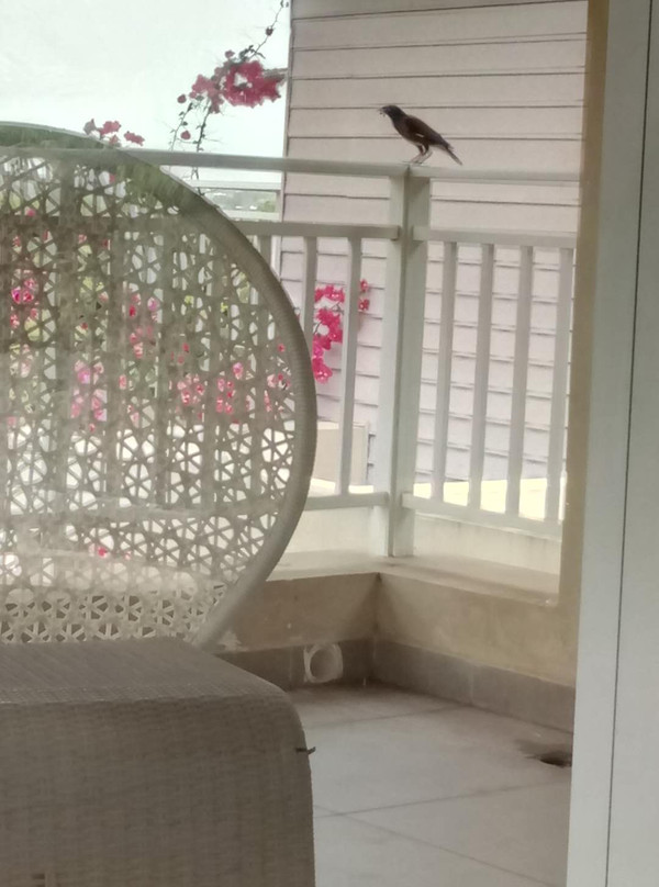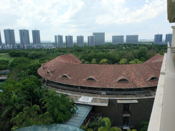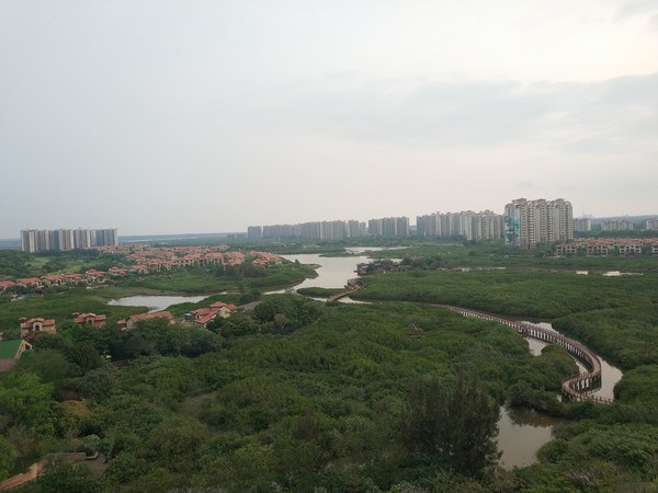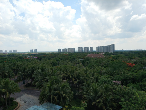 早晨被鸟儿叫醒,蓝天白云映照得红树林格外清丽,站在阳台上看到红树林之间有很多别墅,远处还有不少楼盘,看来富力的这个项目不小啊,据说房价大约是8千到一万多点,温度有点高,感觉到热。