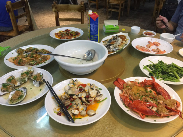 点了3种贝壳加上石斑鱼、花蟹、竹节虾,再炒个蔬菜,喝上新鲜的椰子,味道好极了!