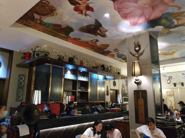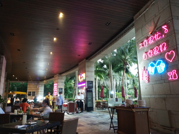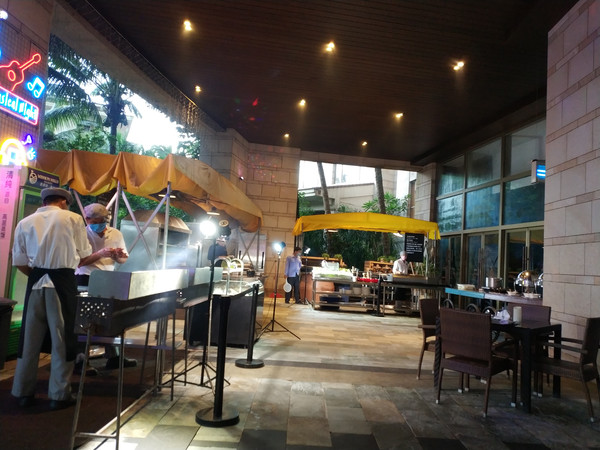 晚餐是酒店套餐中包含的海鲜烧烤自助餐,啤酒饮料按需自取,火岩西餐厅在酒店的-1层,环球主题的风情烧烤在装饰炫丽的霓虹灯缭绕下香气扑鼻,食物琳琅满目,雨后的天气凉爽,吹着微风,听着美妙的音乐,喝着凉爽的扎啤。